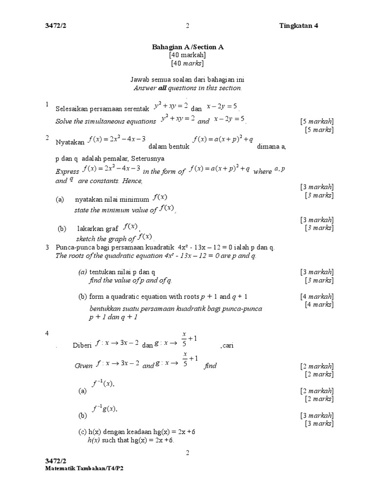Additional Mathematics Papers Top Posts amp Pages Latihan Matematik Tingkatan 5 Mathematics Form 5 Exercises Kertas Soalan Pertengahan Tahun Matematik Tingkatan 4 Mathematics Form 4 Mid Year. Kertas 2 Bahasa Melayu Trial Pmr 2013. Paper 1 Section B Continuous Writing 3 5.